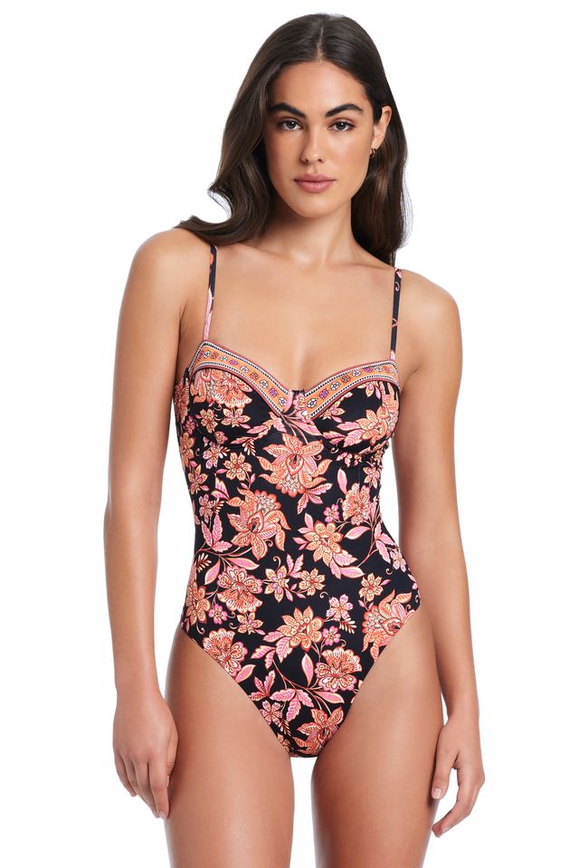 Introducing our Deja Vu One Piece, A timeless swimsuit featuring a rich floral print, a flattering structured bust, and adjustable straps for a confident, comfortable fit.